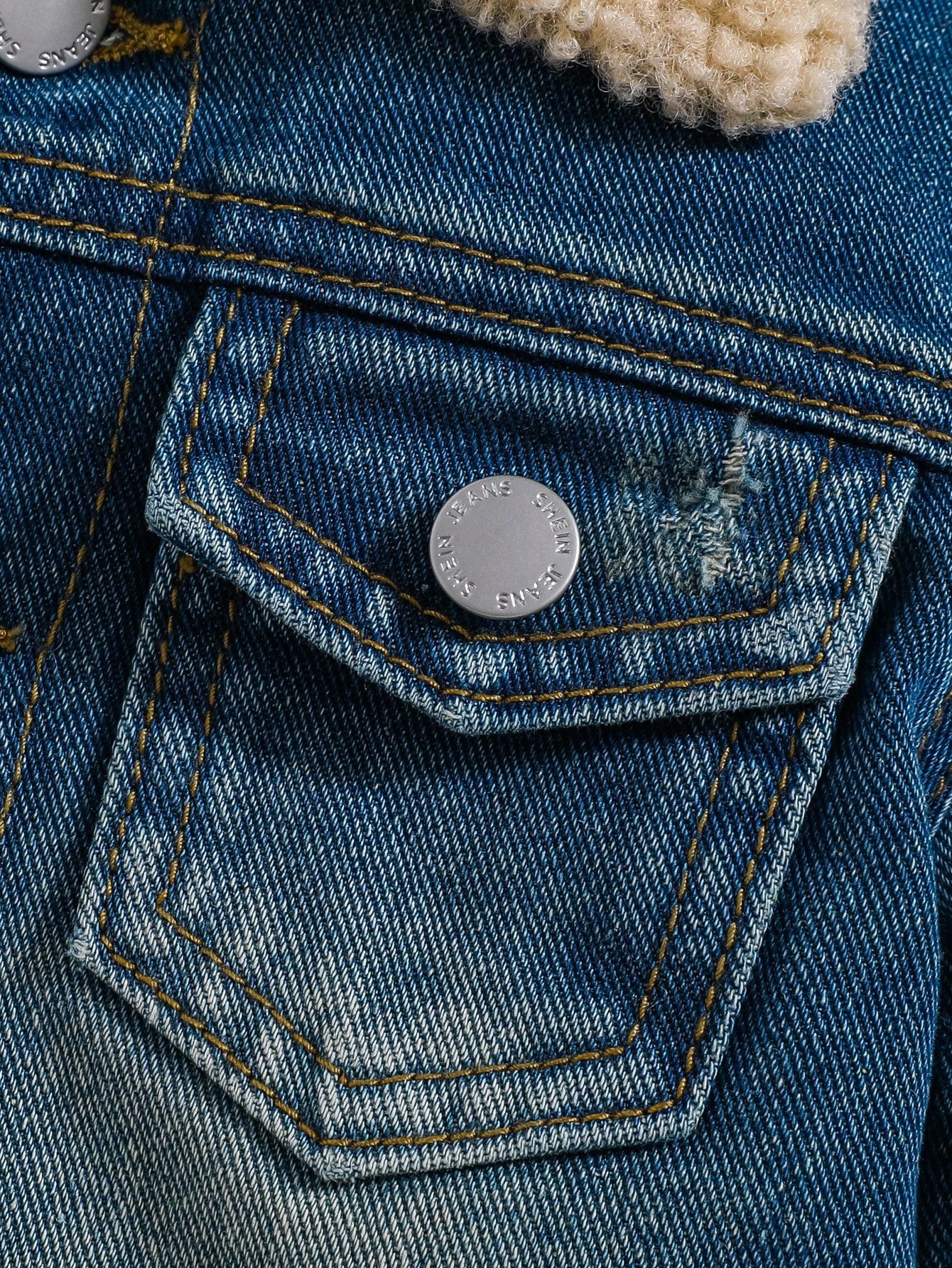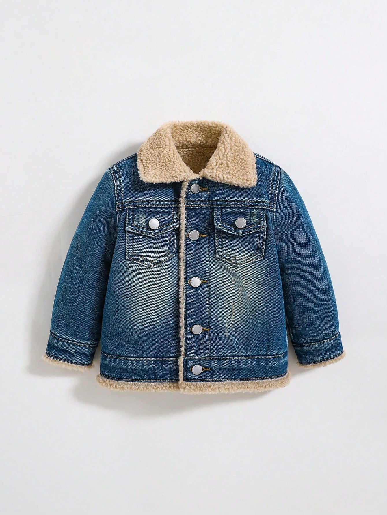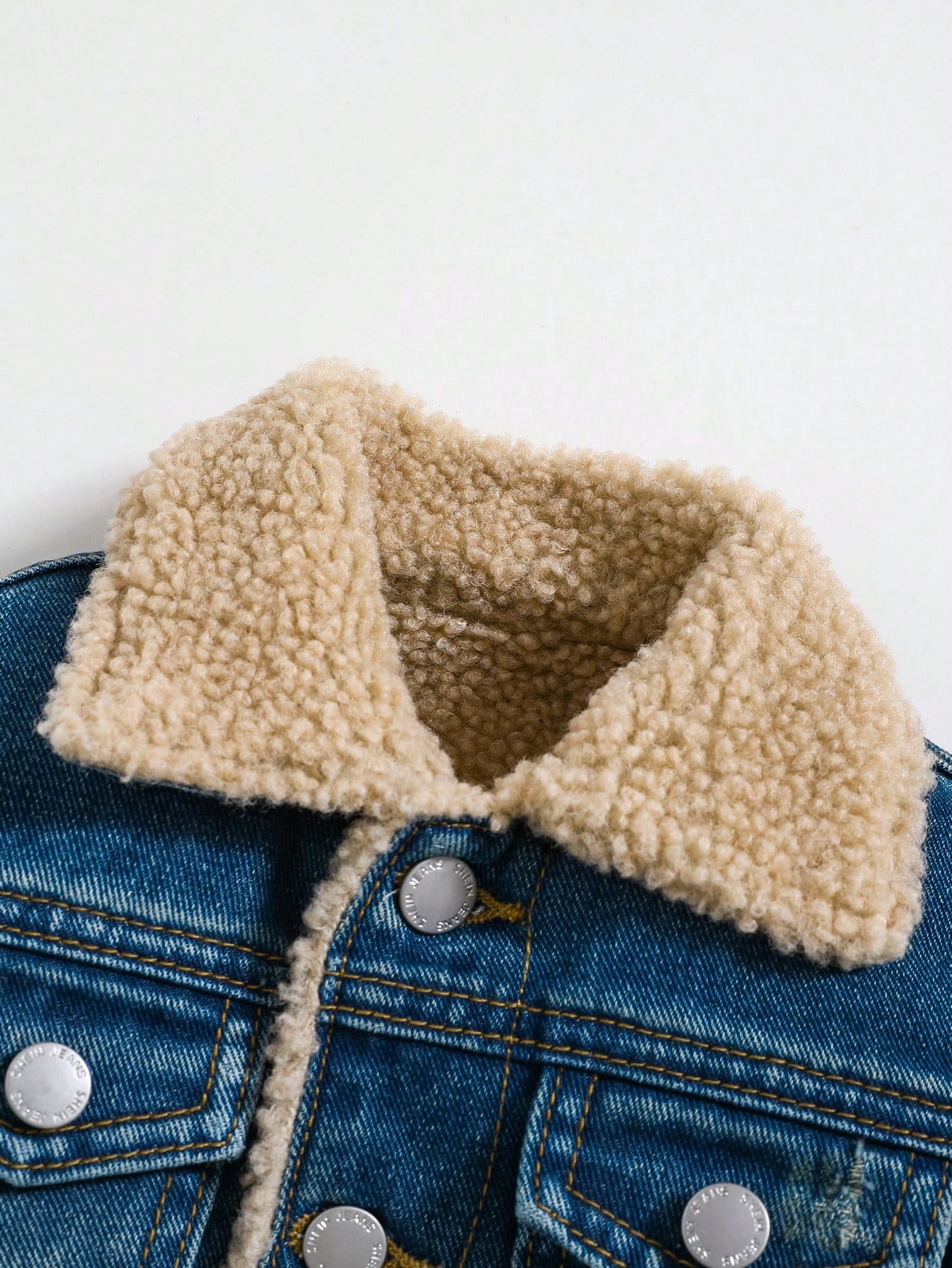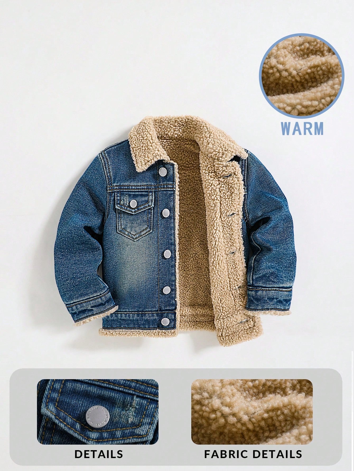 معطف تيدي للأطفال الصغار من الجينز والفليس اللين والناعم، ذو ياقة واقية، أكمام طويلة، بطانة حرارية، لملابس الخريف/الشتاء للأولاد الصغار