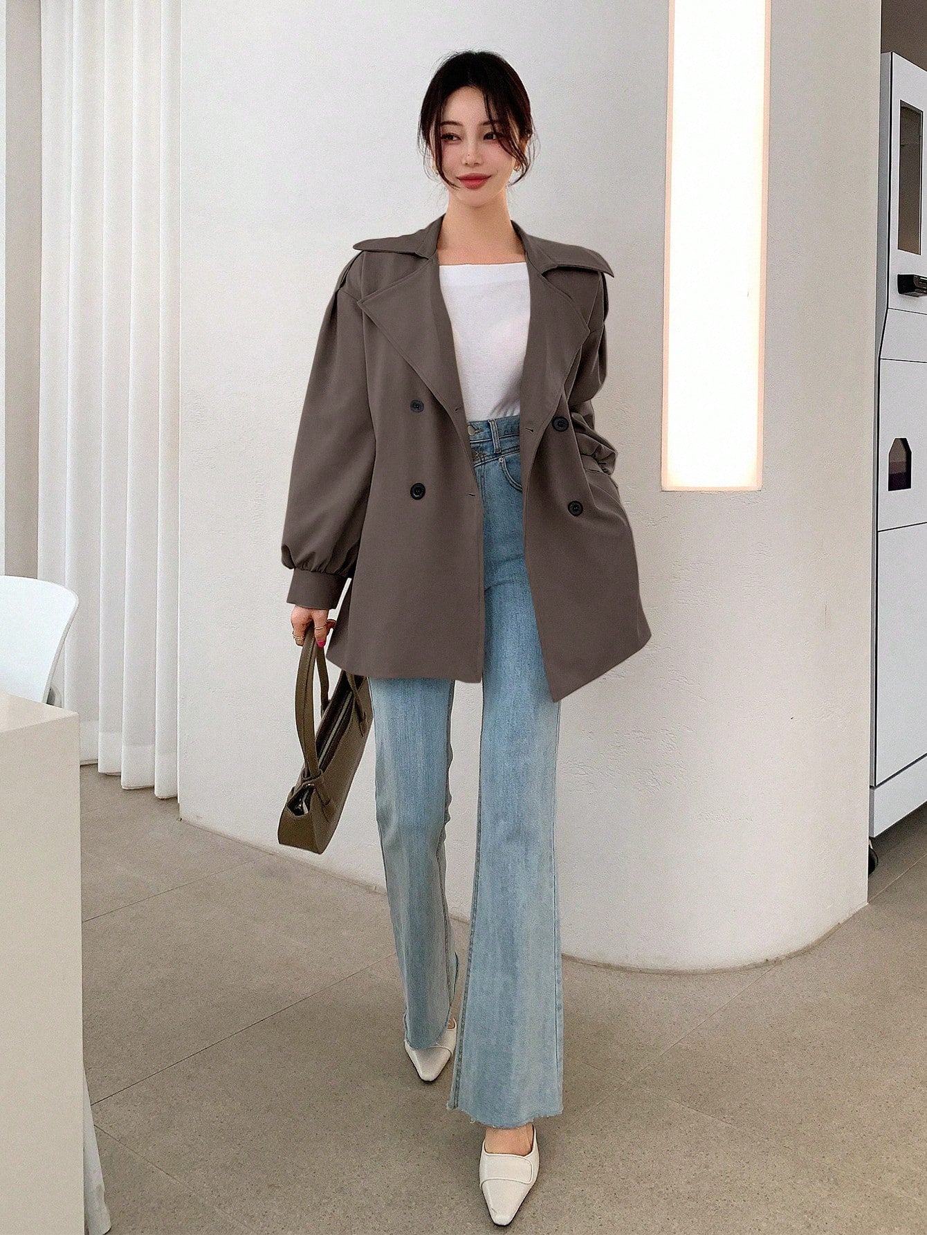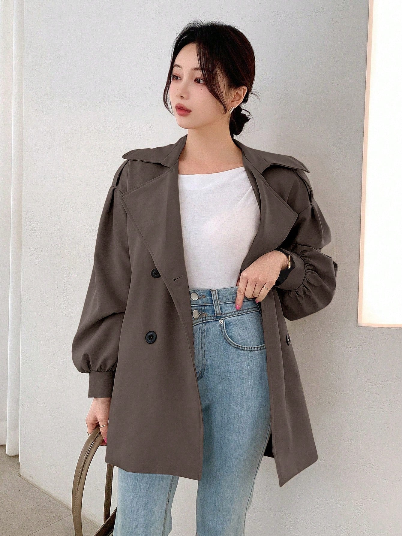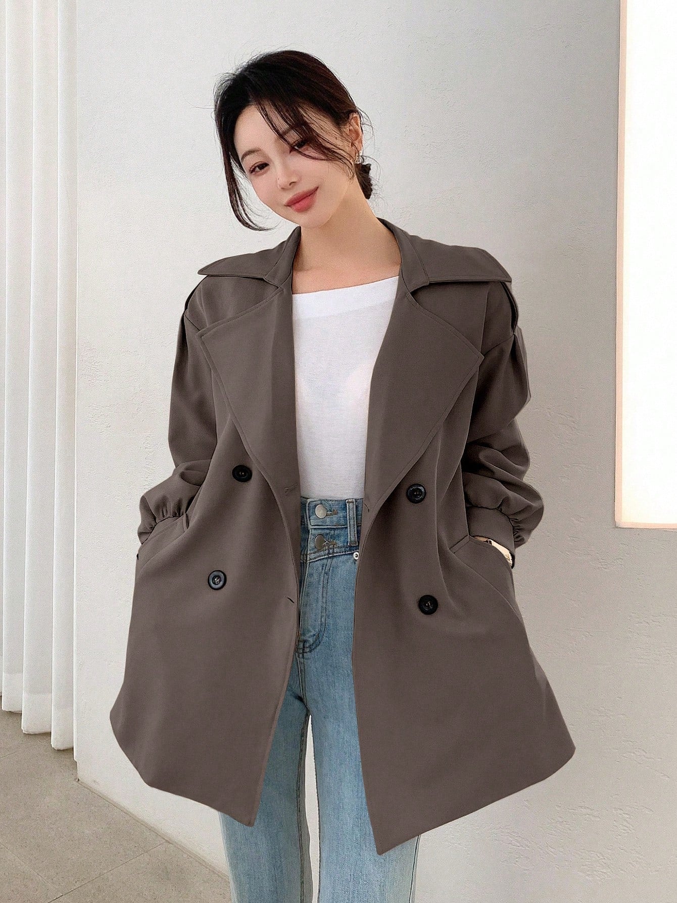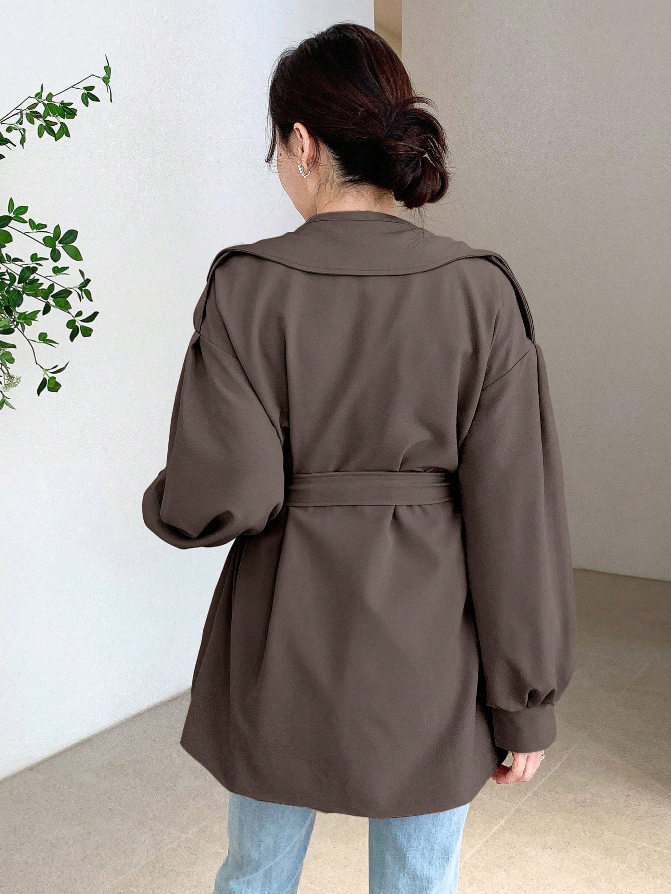 معطف خندق طويل بأكمام طويلة وحزام مزدوج الصدر لون واحد للنساء