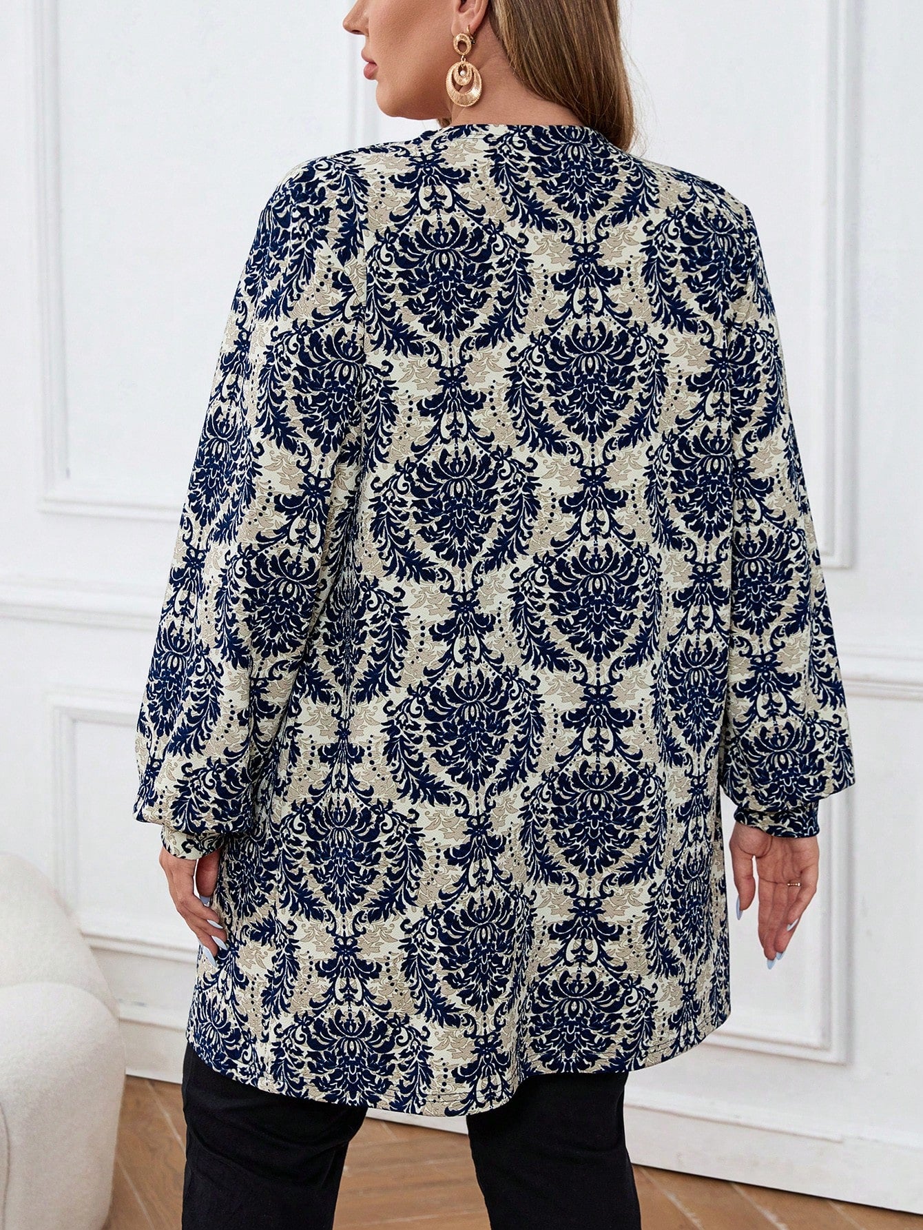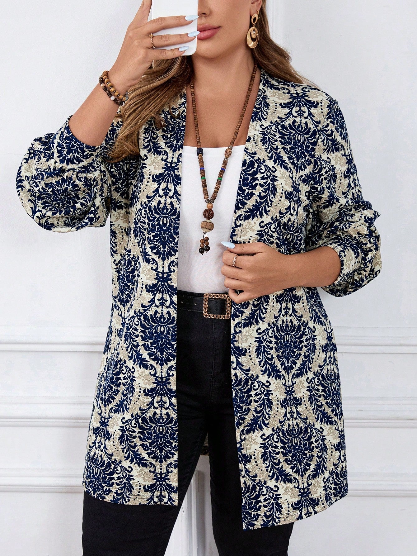 معطف كاجوال بأكمام طويلة بطباعة نباتية مقاس كبير، ملابس الخريف