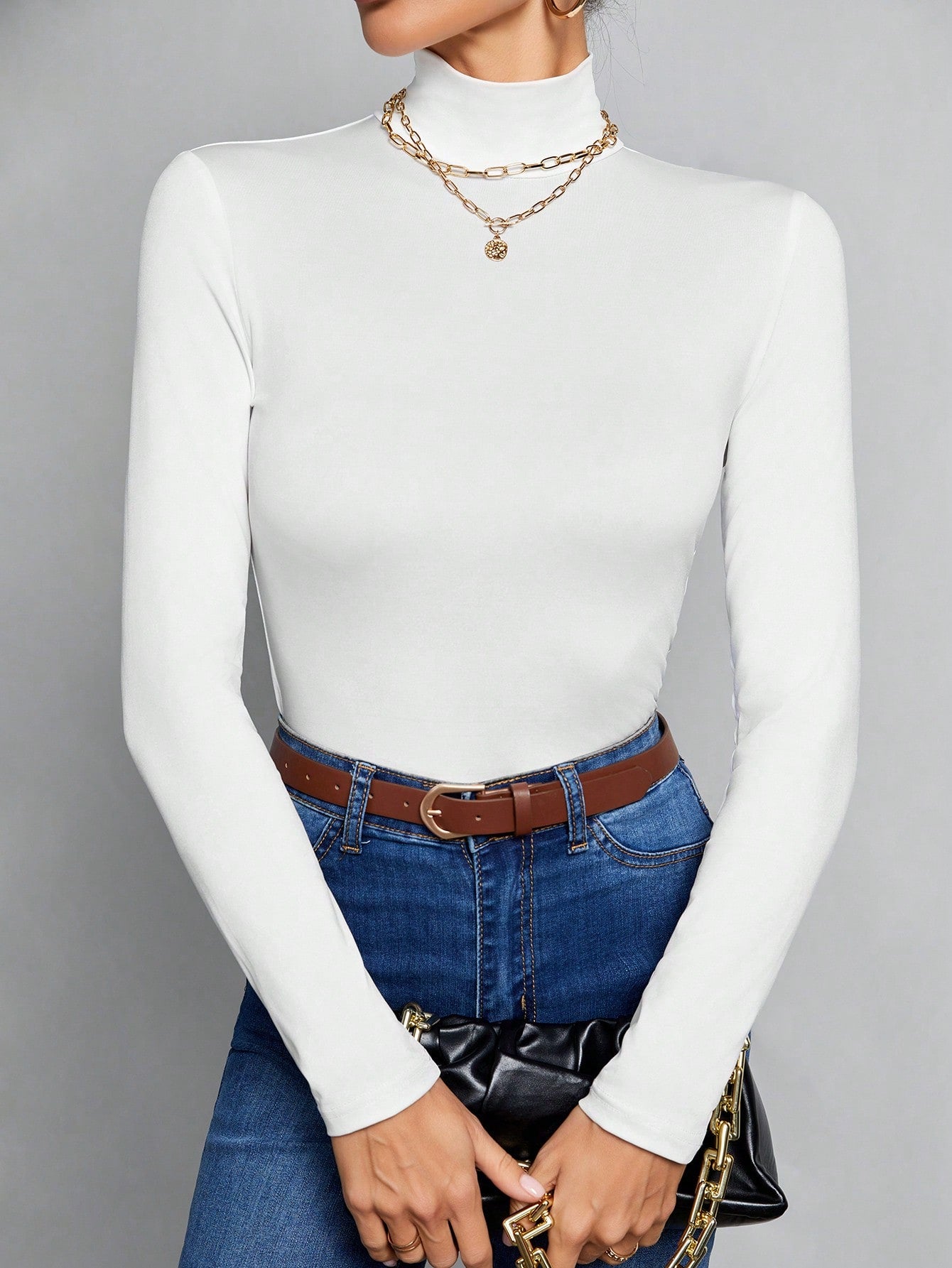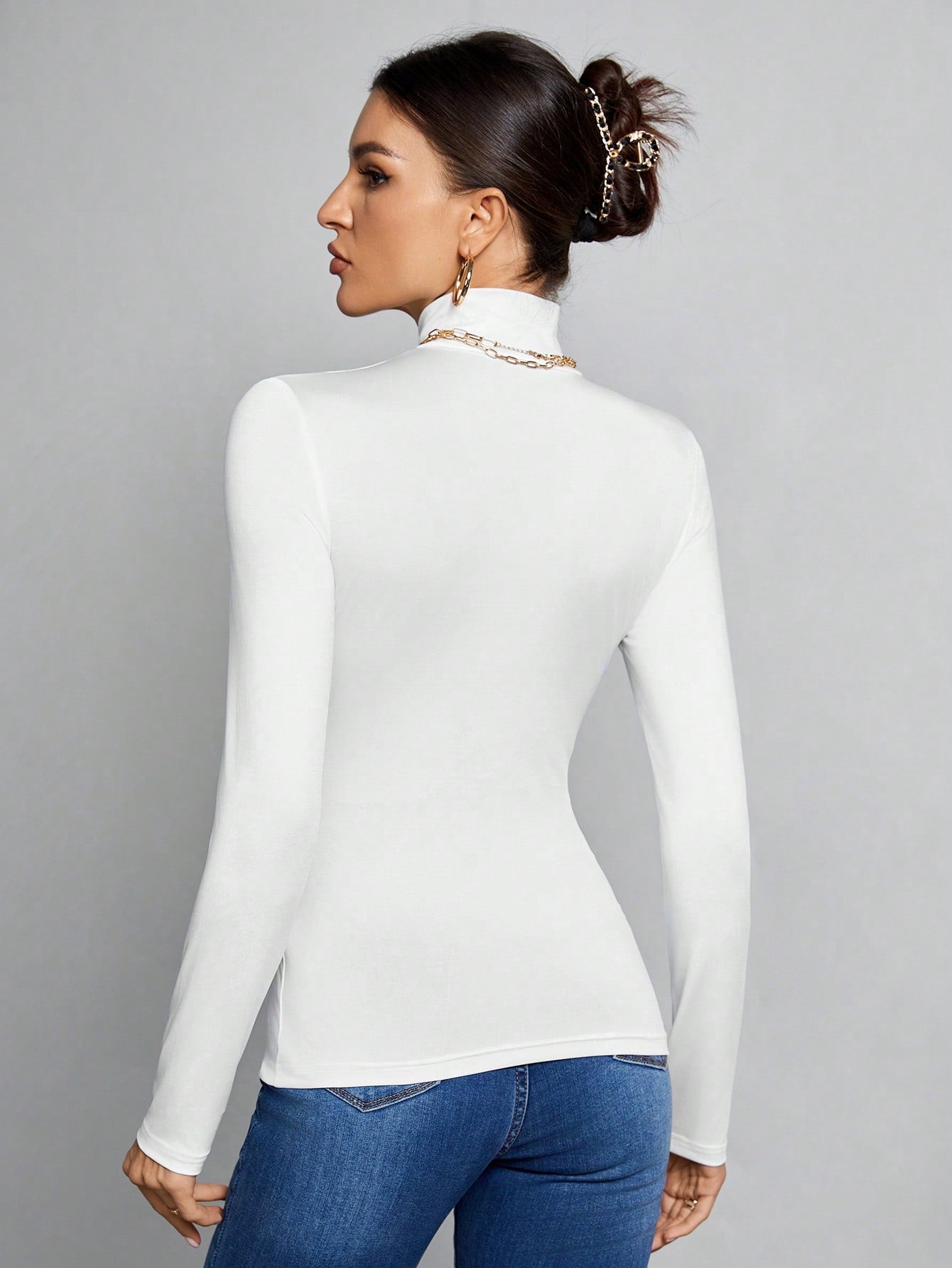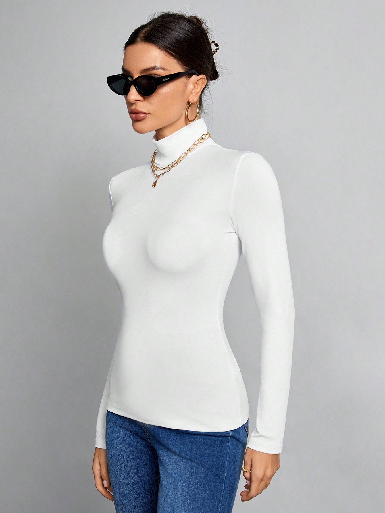 ملابس علوية أبيض عالي الياقة نحيف ذو لون أحادي مناسب للخريف والشتاء