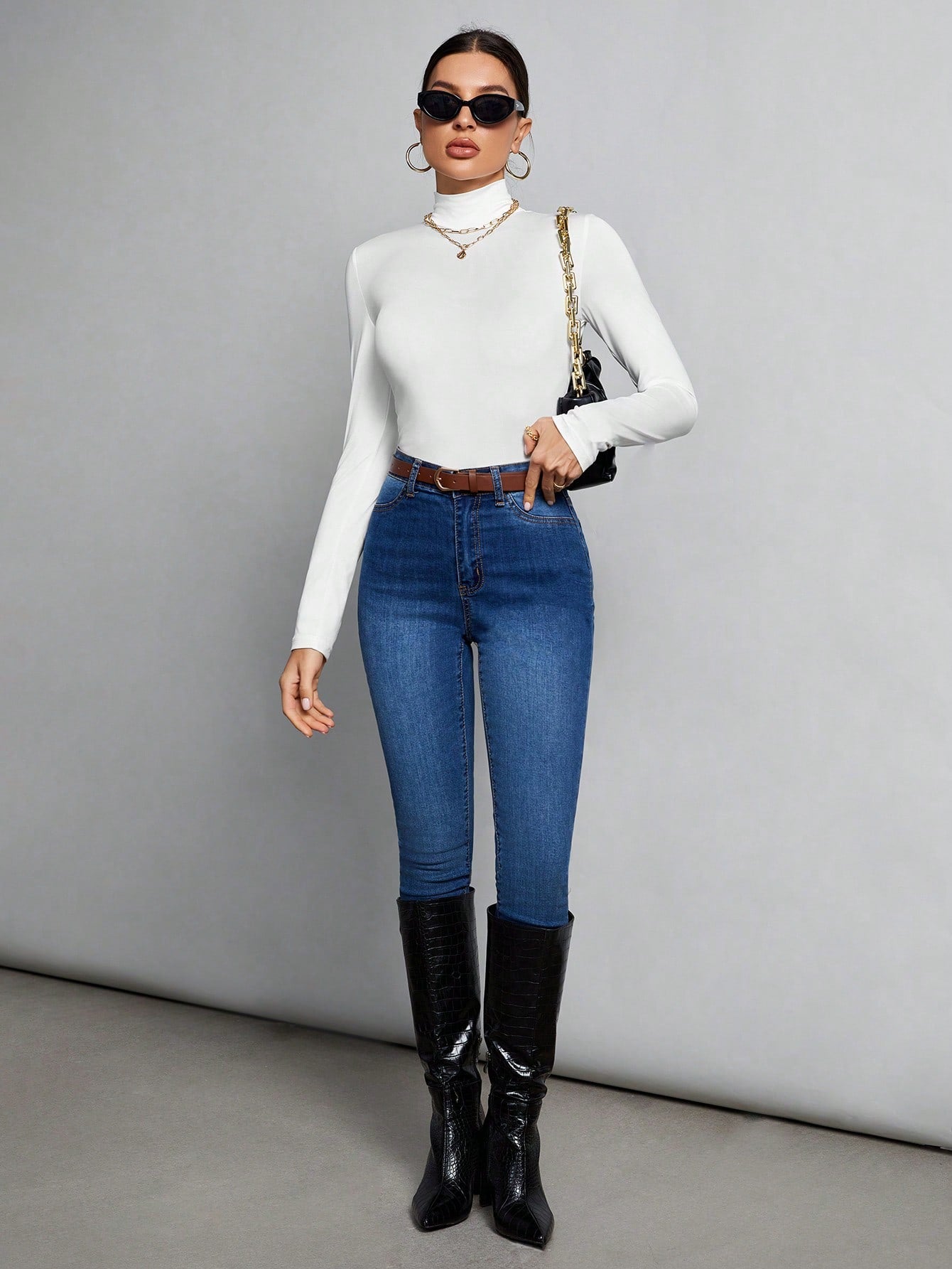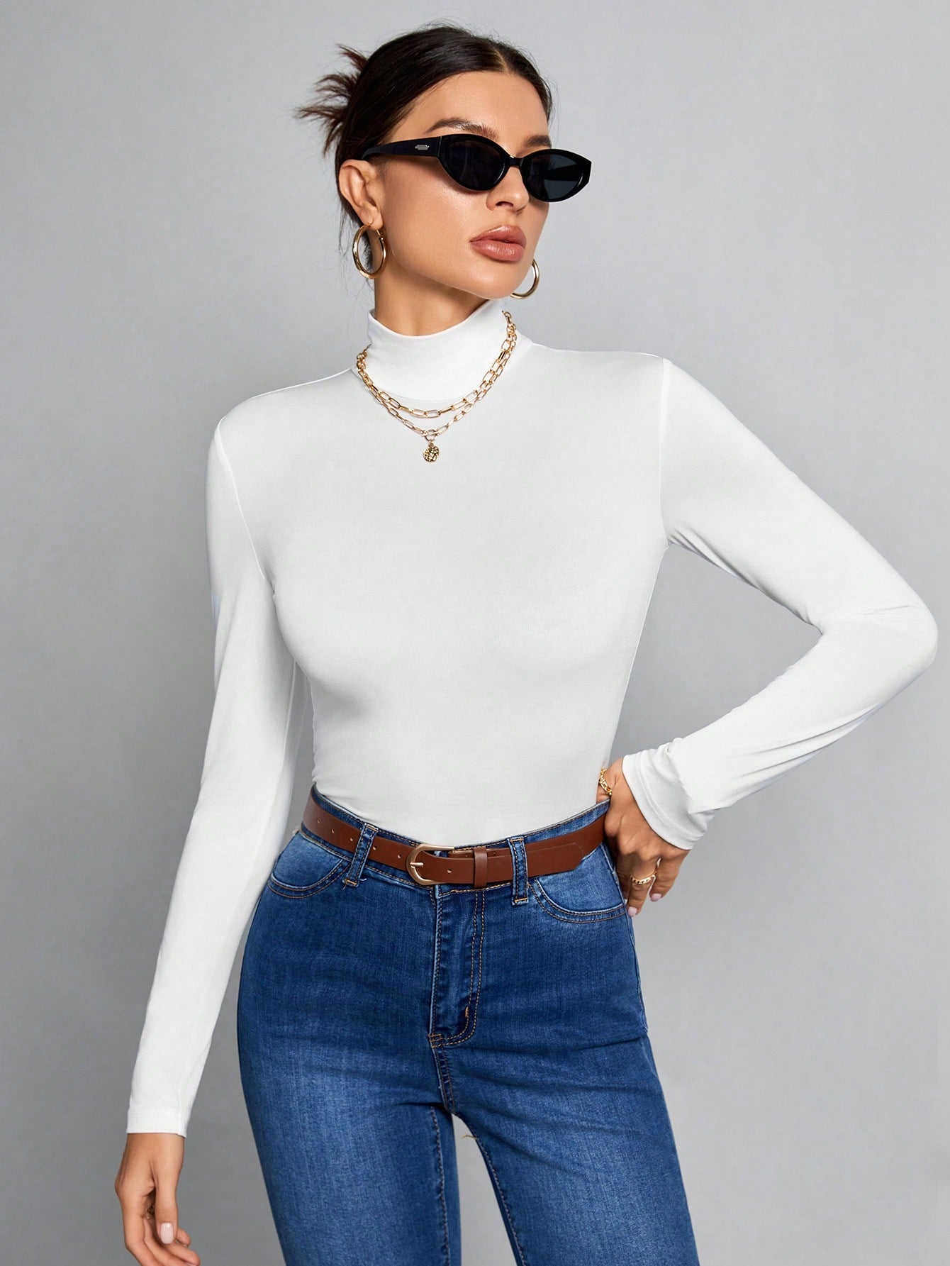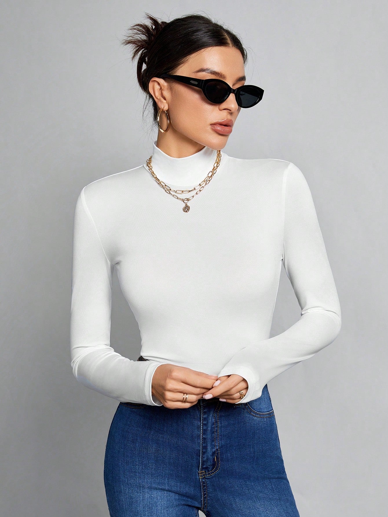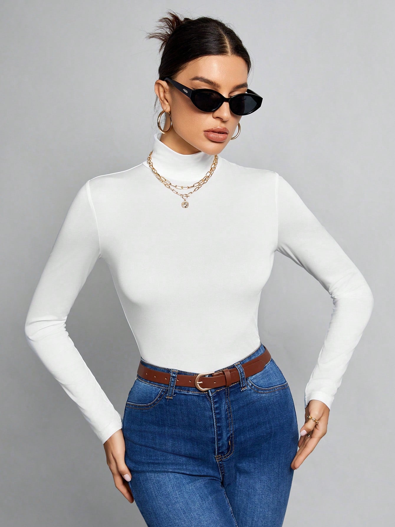ملابس علوية أبيض عالي الياقة نحيف ذو لون أحادي مناسب للخريف والشتاء