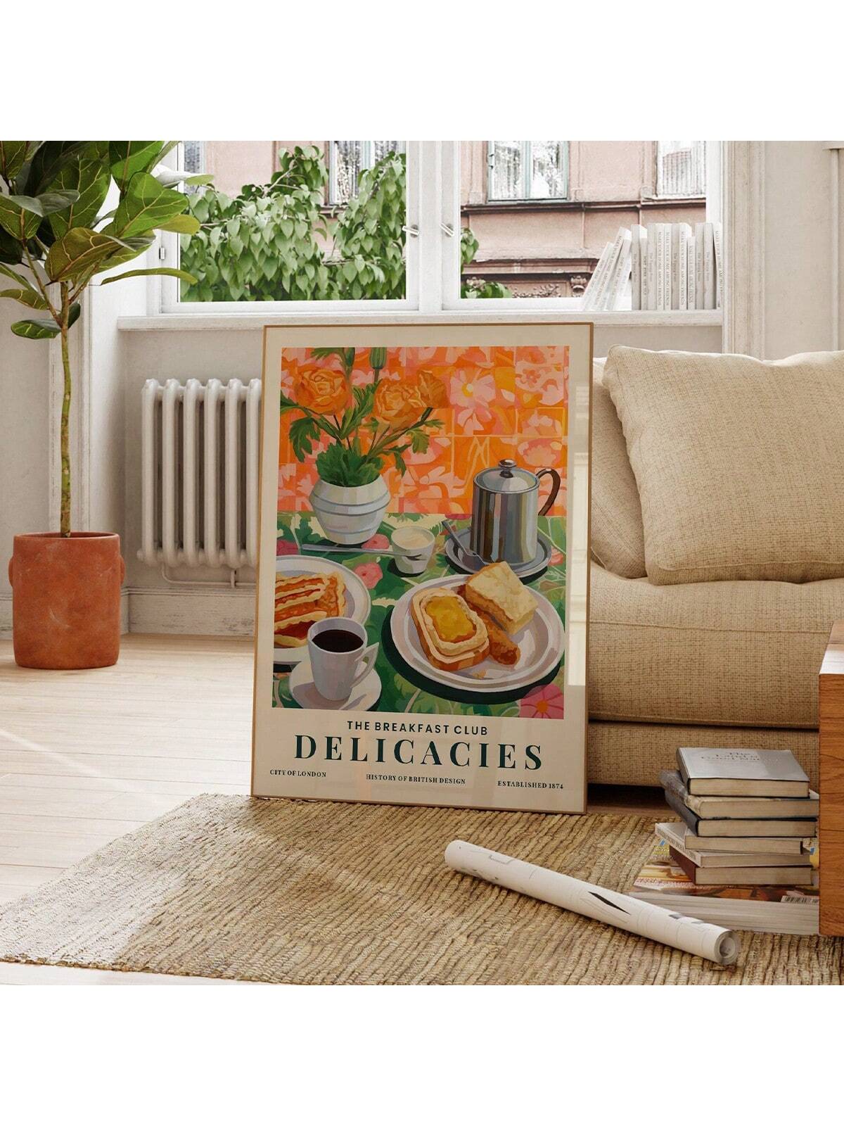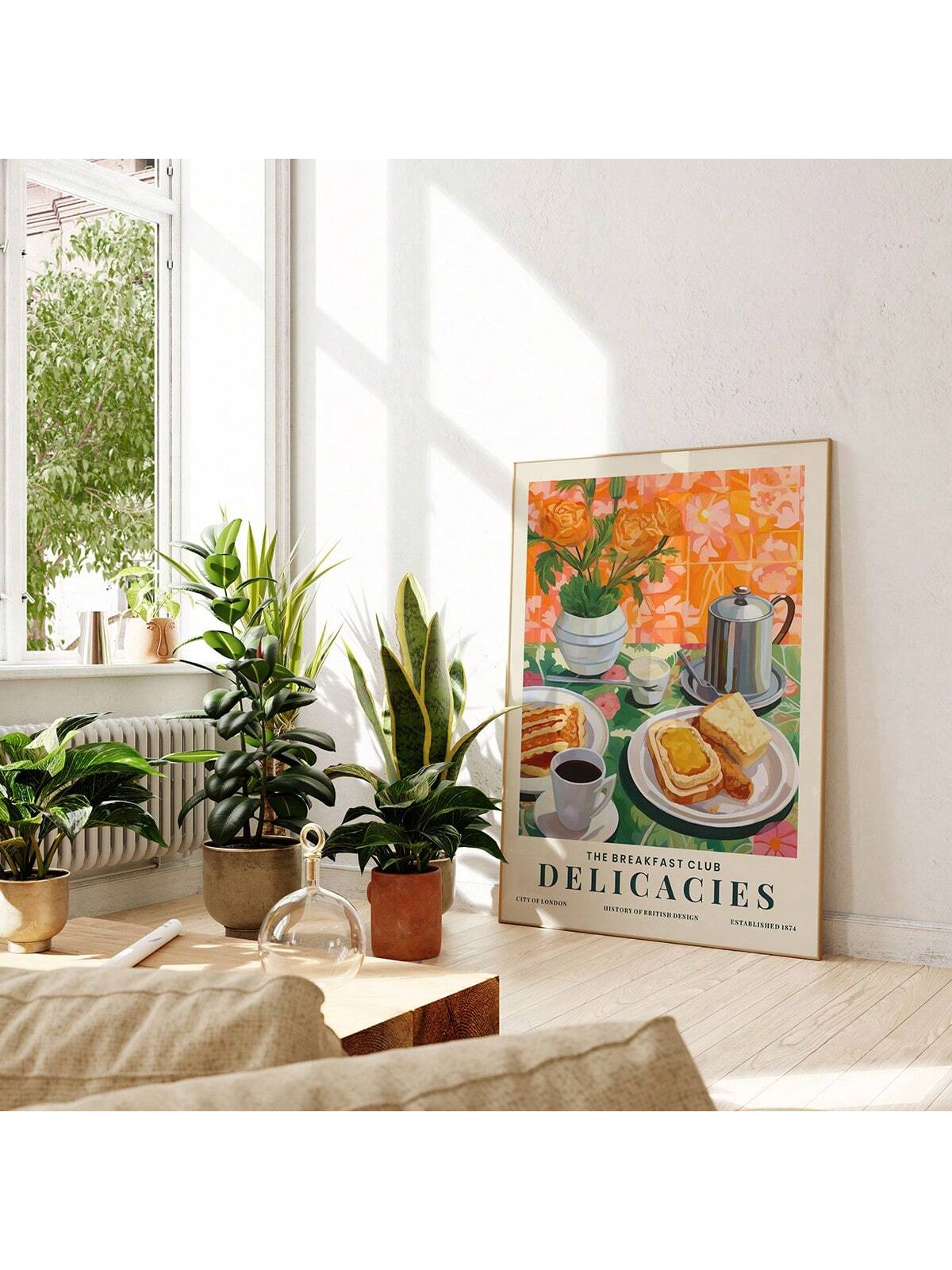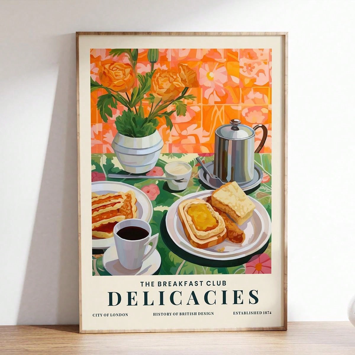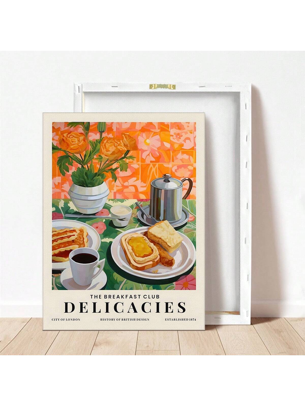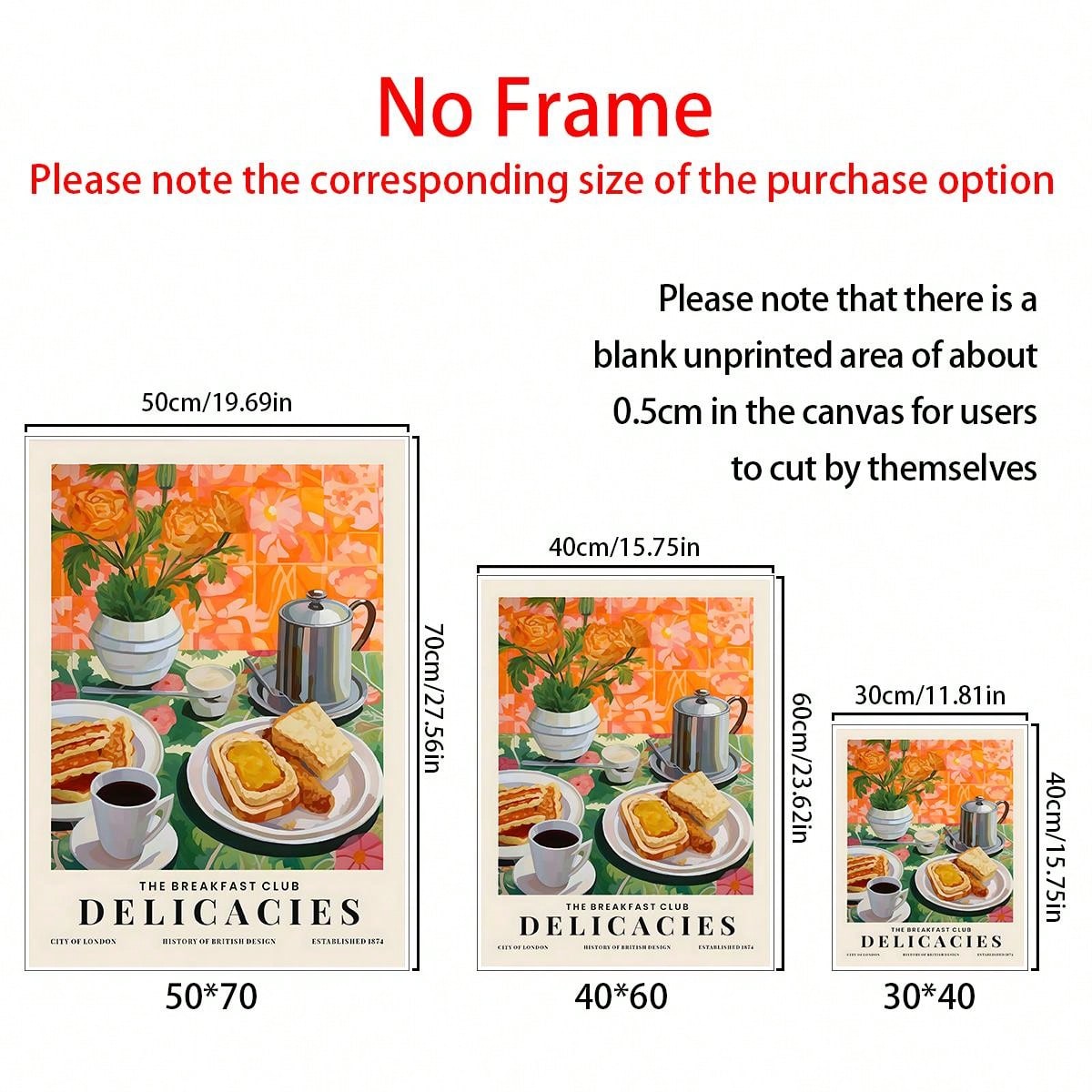 ملصق طبيعة صامتة مطبوع بالشاي والخبز لوجبة الإفطار، ملصق جداري للمطبخ، زهور، ملصقات ملونة، هدية للمحبين للطعام، ديكور ممتع، ملصقات كانفاس للمطبخ المنزلي