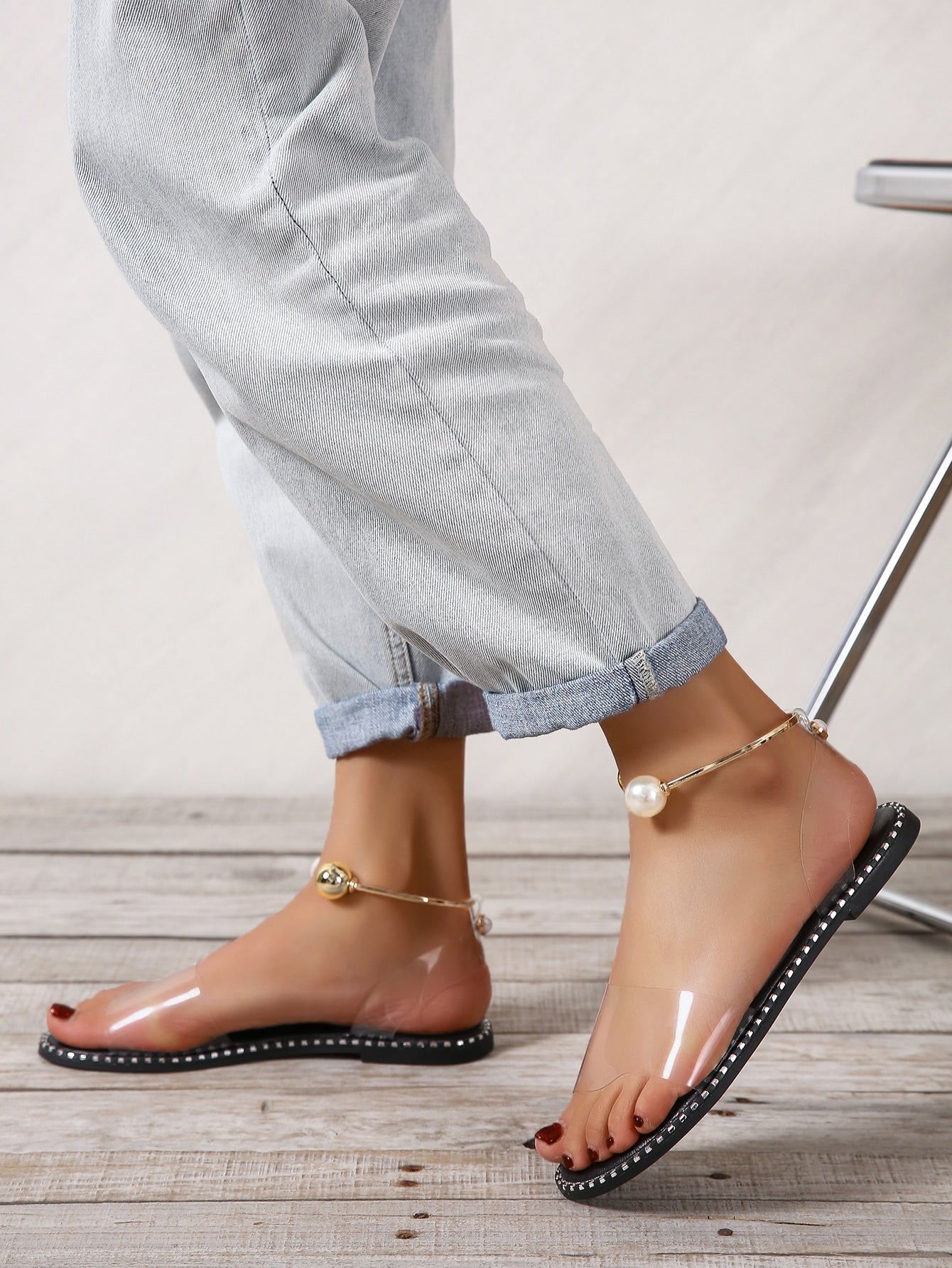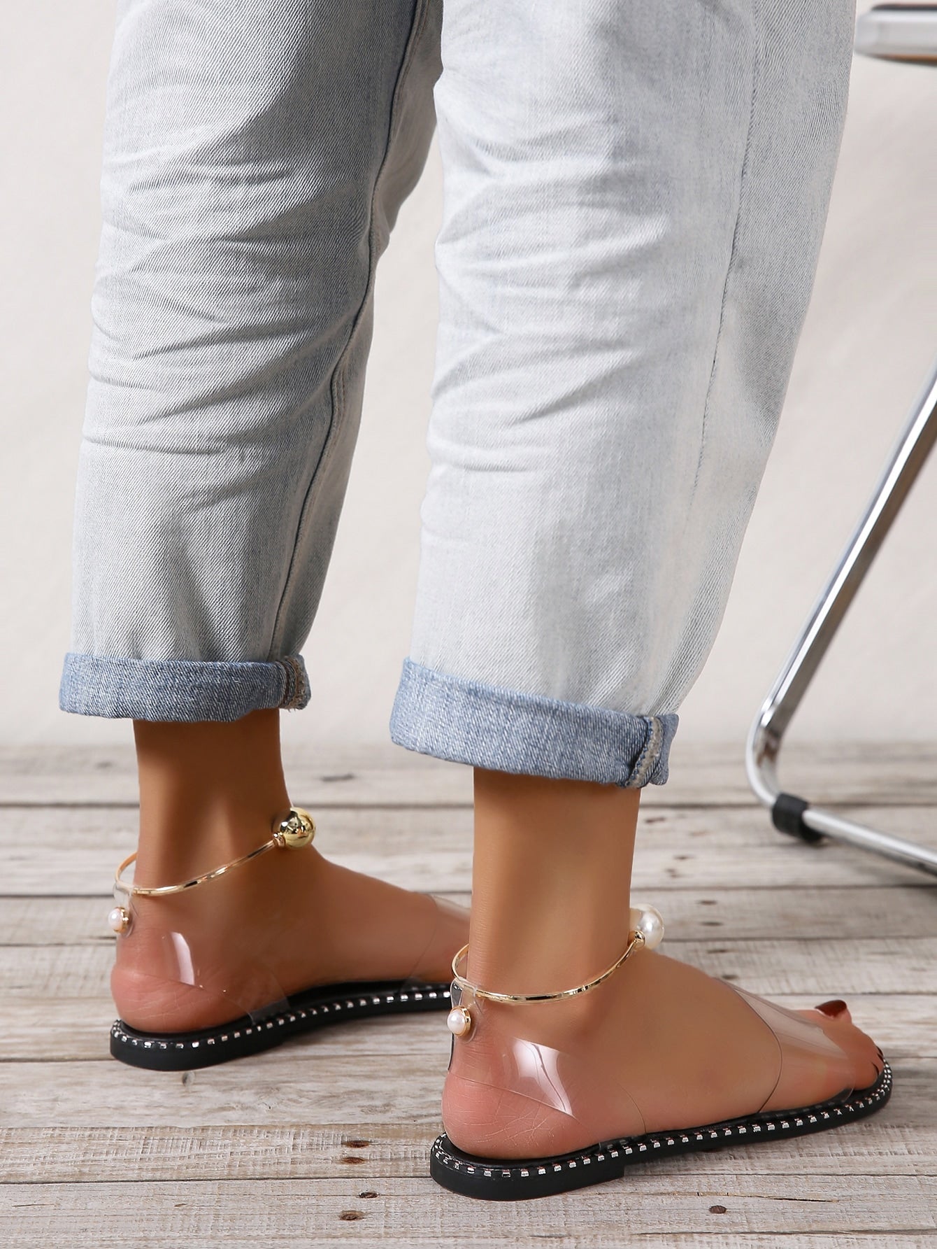 نساء صناعي مزخرف بلؤلؤ أسلوب أساسي حزام صنادل ومفتوح الوراء , الموضة باصابع قدم مفتوح كاحل شريط صنادل مسطح