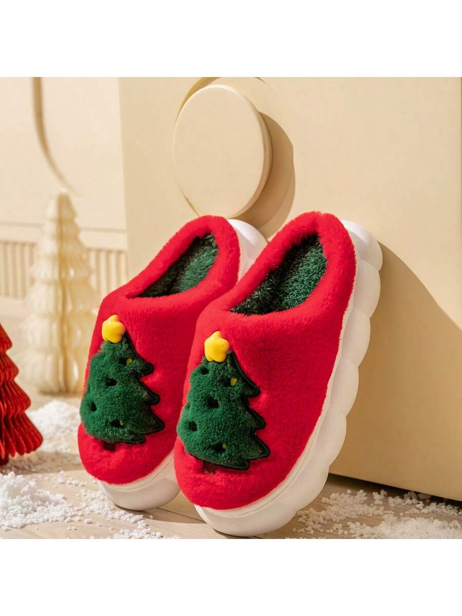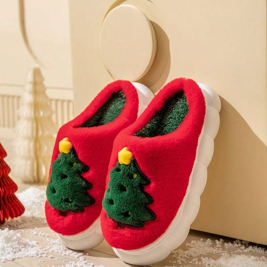 نعال دافئة مبطنة بتصميم شجرة عيد الميلاد الكرتونية للرجال والنساء ، خريف/شتاء