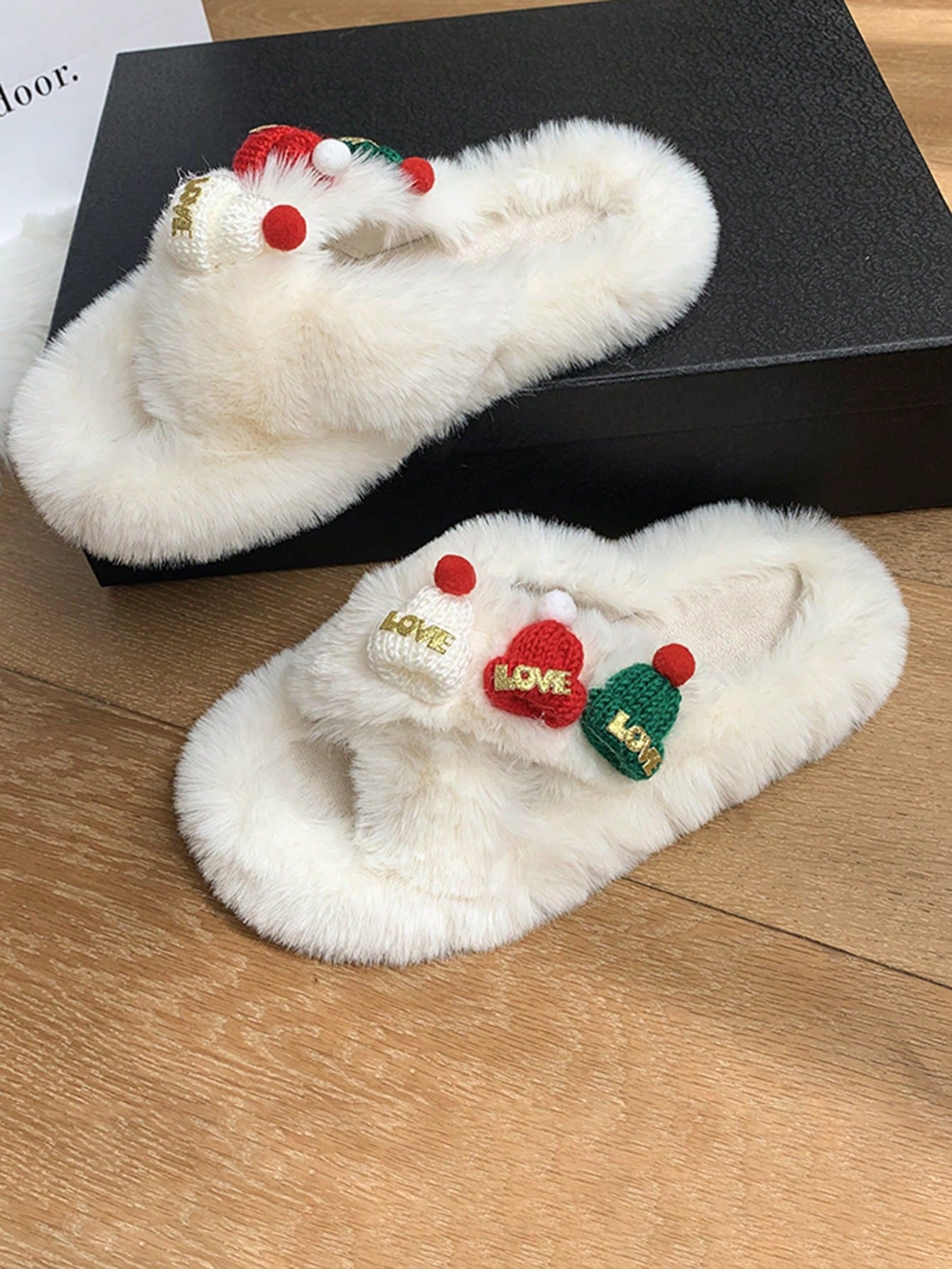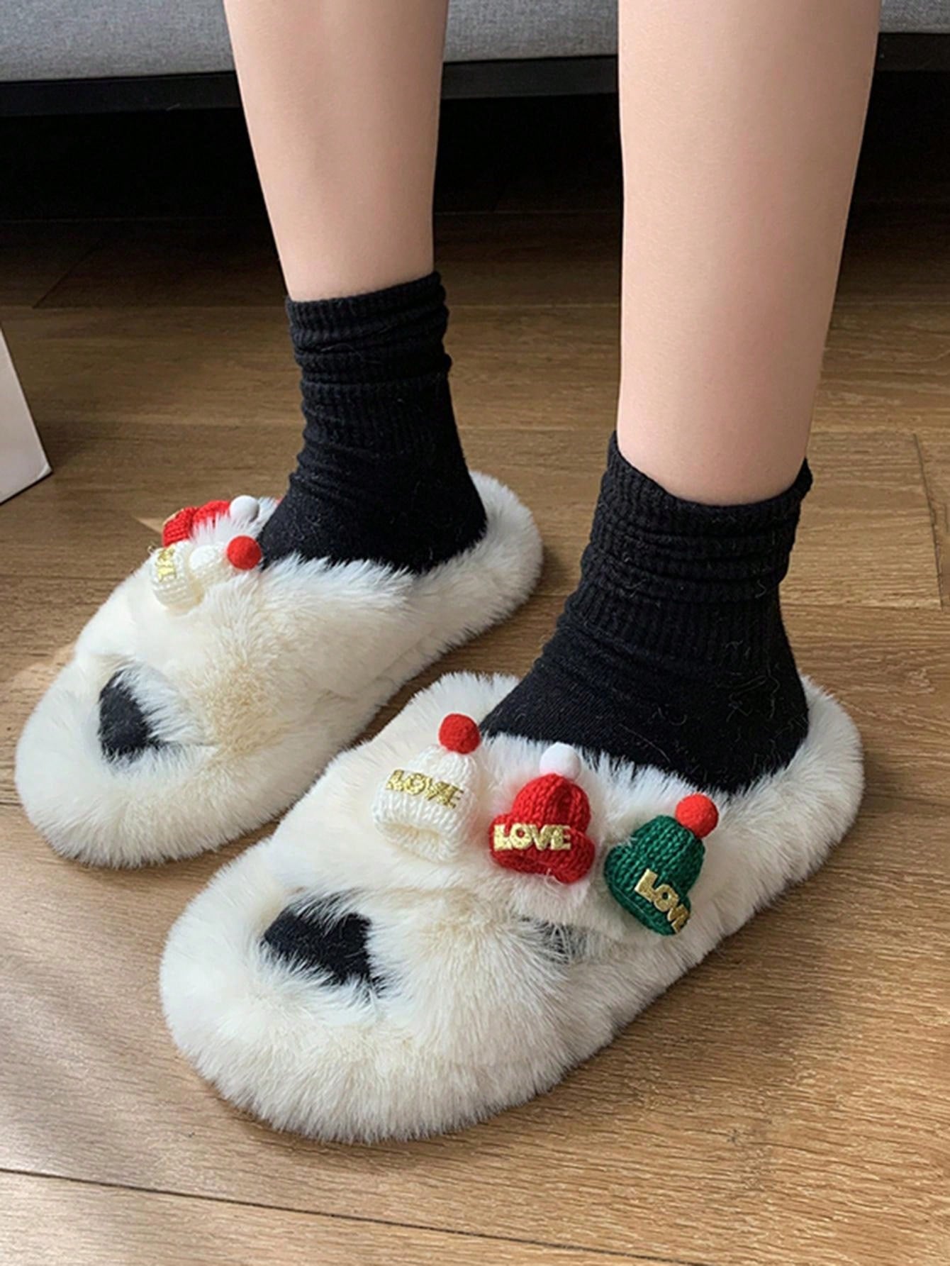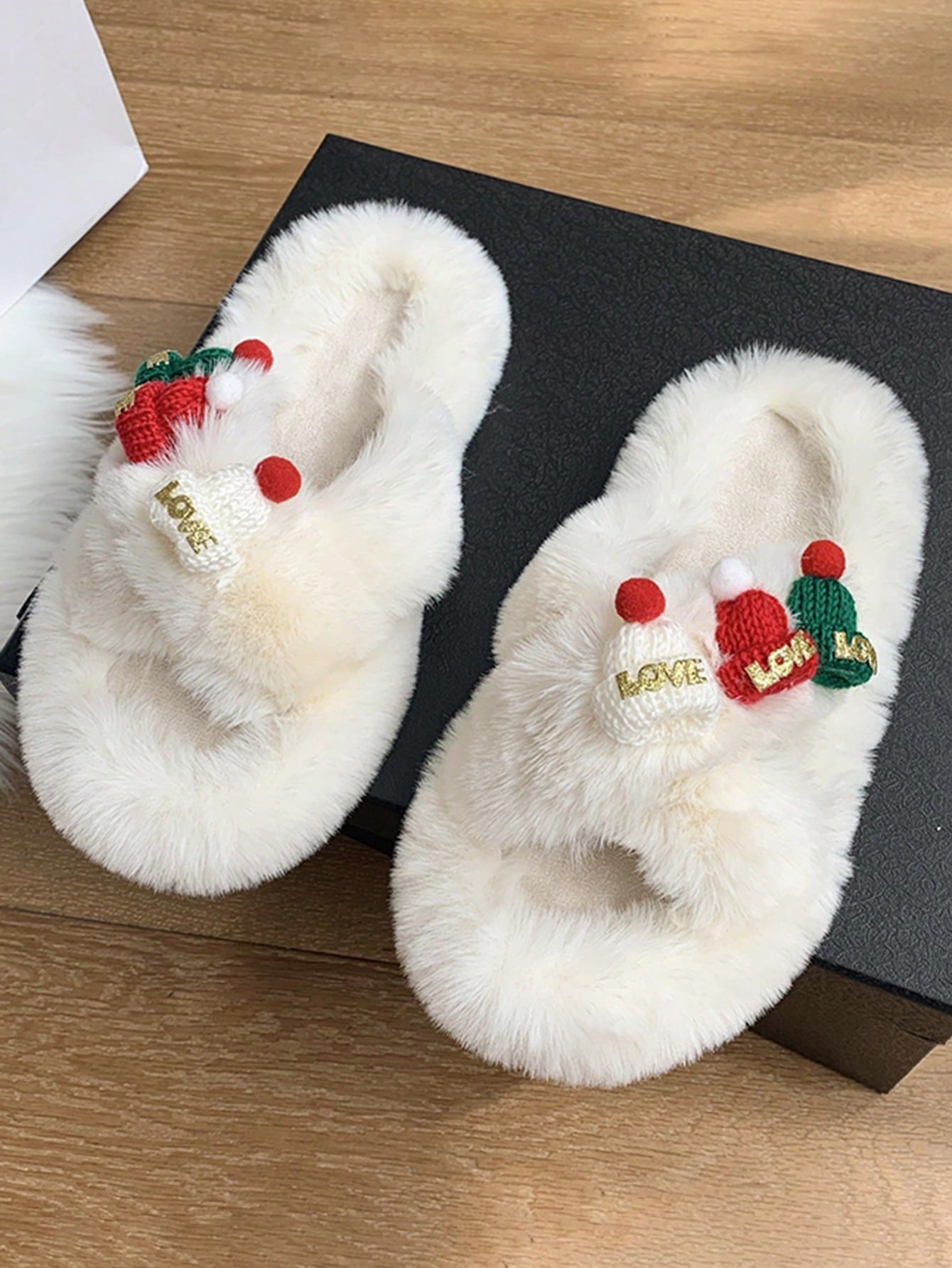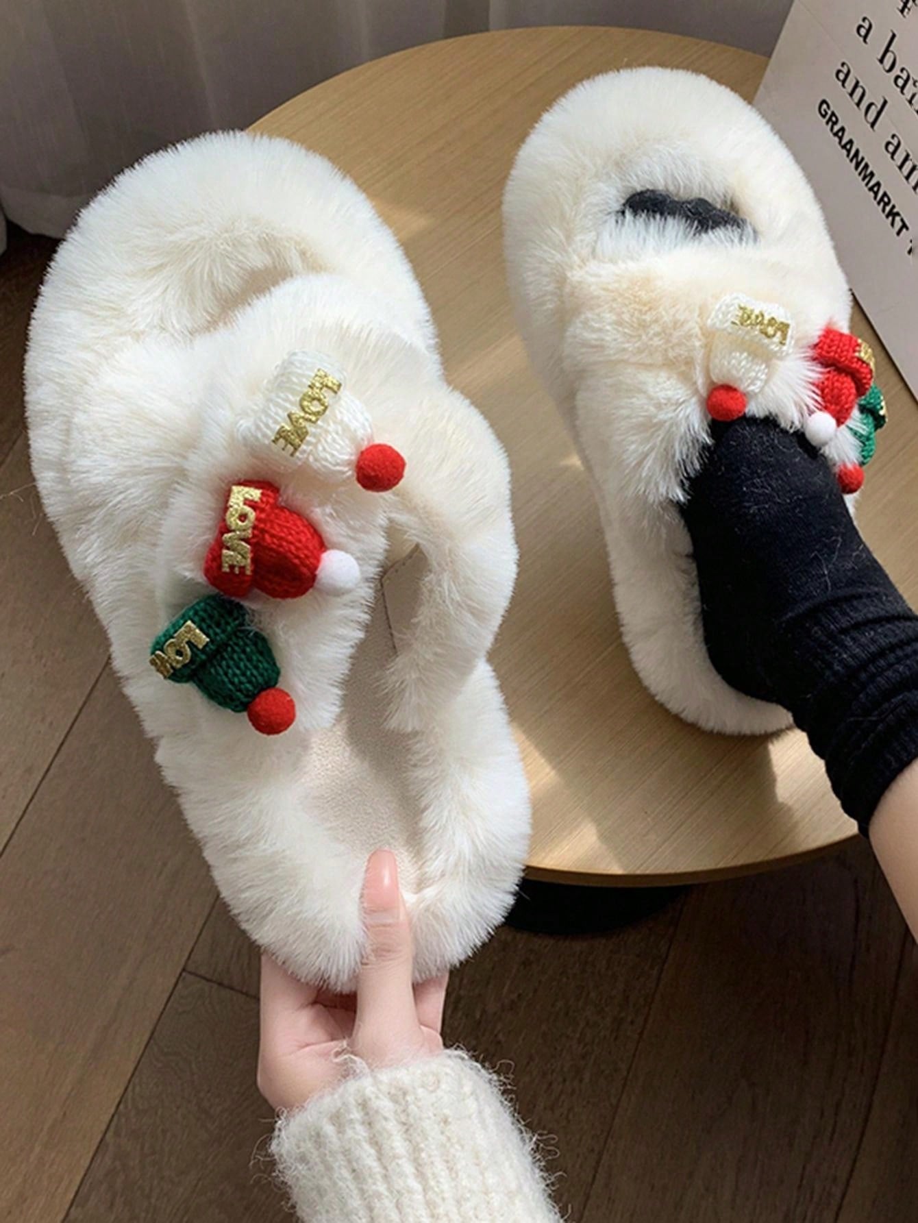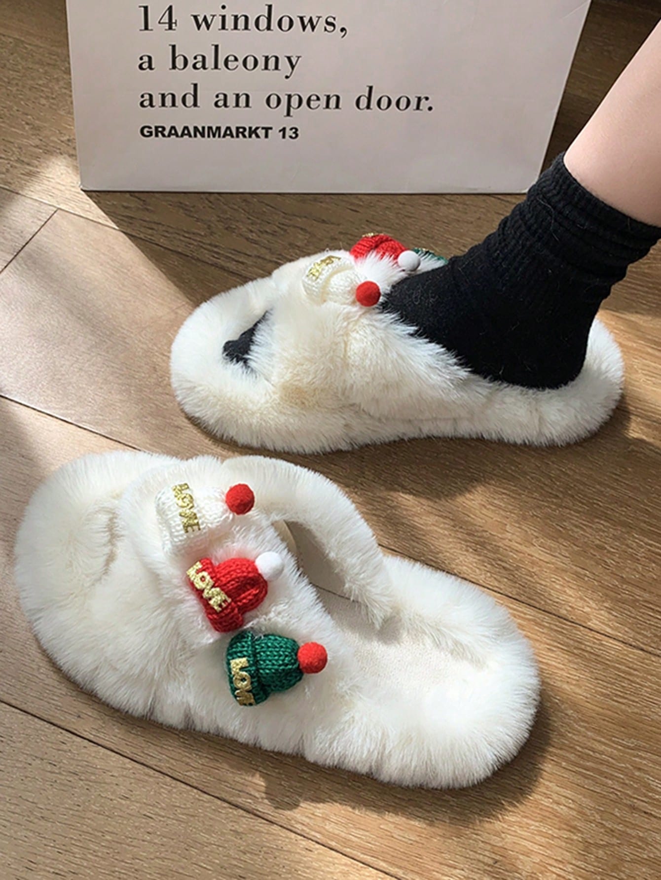 نعل داخلي/خارجي سميك من النعالات المنزلية بنقشة سانتا كلوز وشجرة الميلاد البيضاء الناعمة للنساء