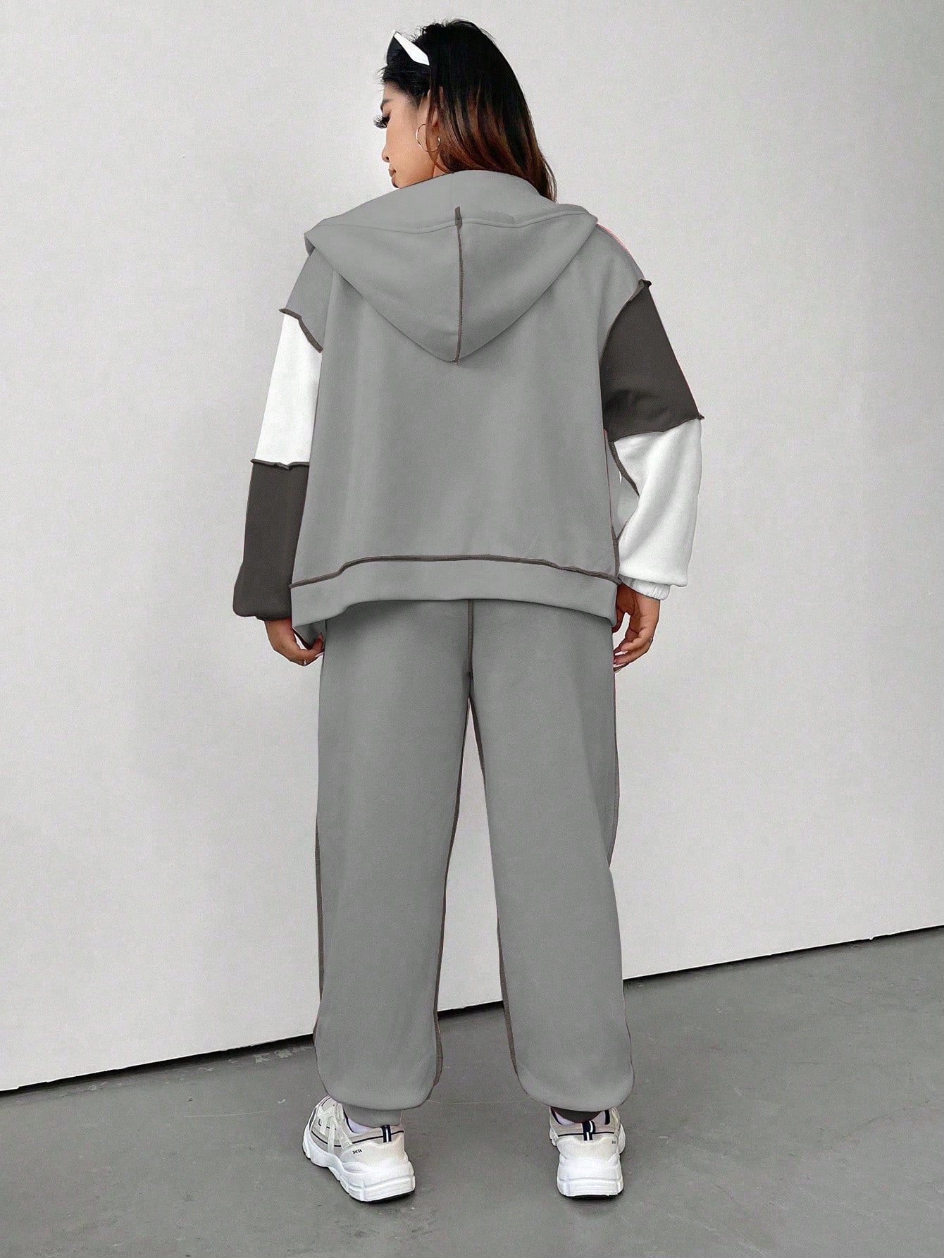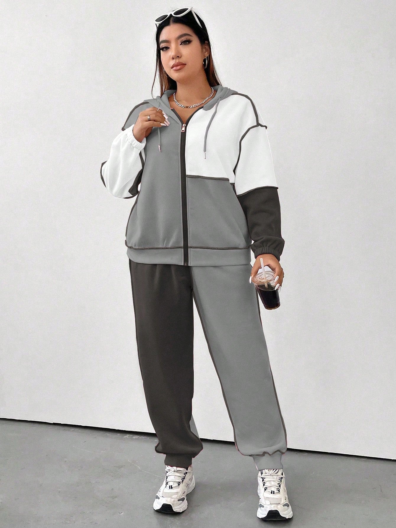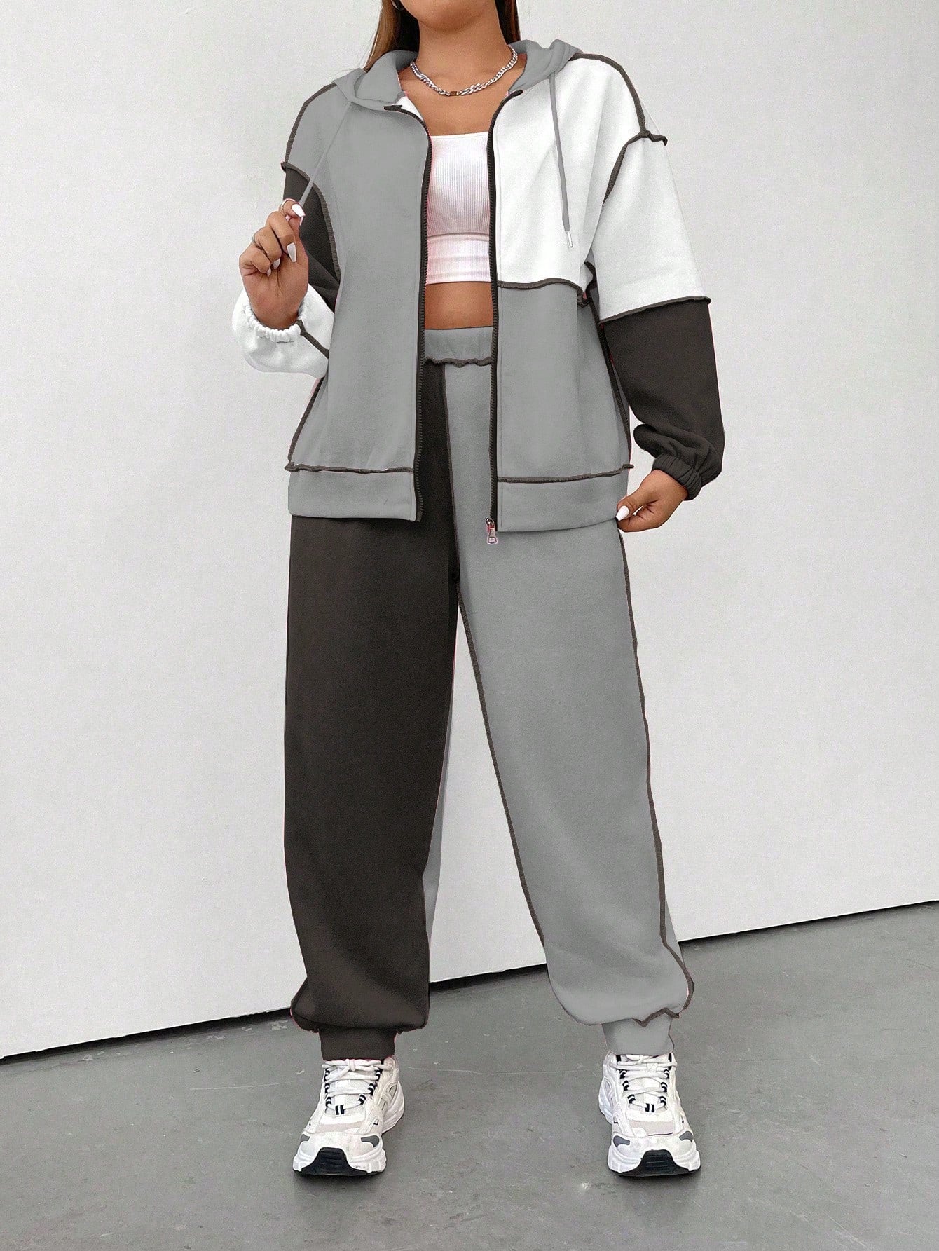 هودي وبنطلون رياضي ألوان متباينة شريط منسوج منخفض الاكتاف مقاس كبير