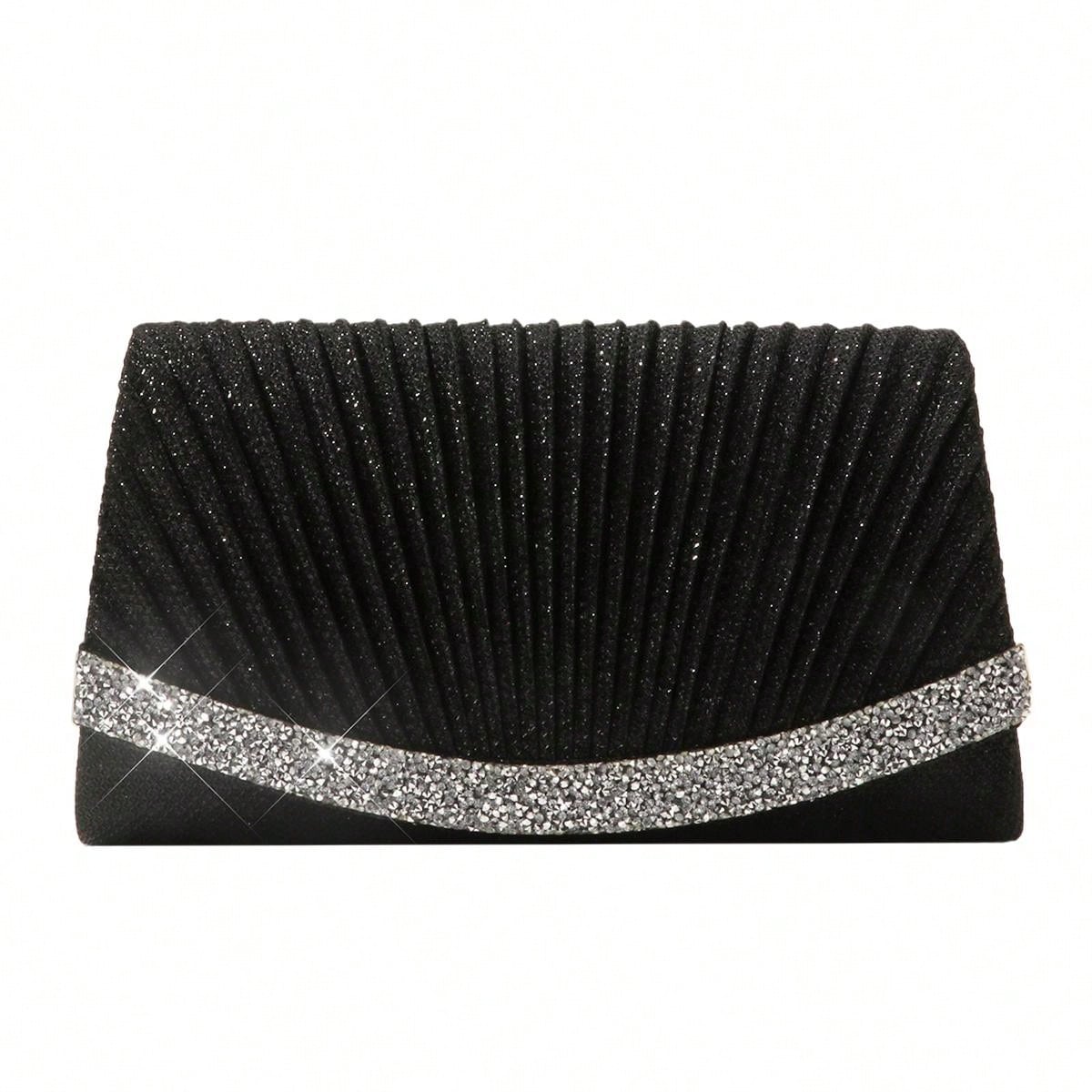 حقيبة مسائية ميني سوداء مزينة بالغليتر، حقيبة مربعة فاخرة مطوية ومزينة بالأحجار الكريستالية اللامعة
