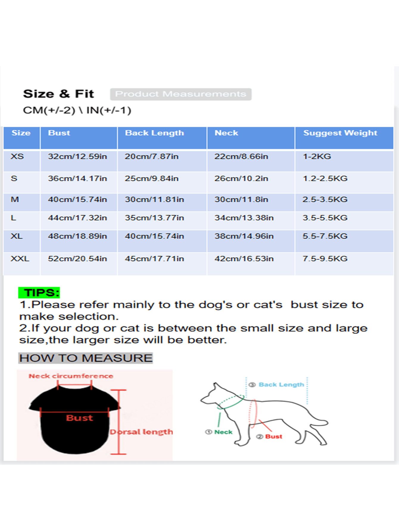 | Size | Back Length | Bust | Neck |