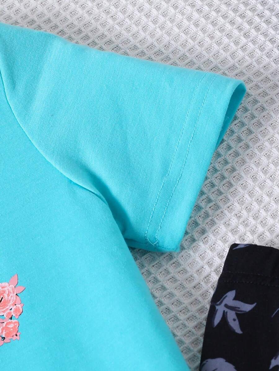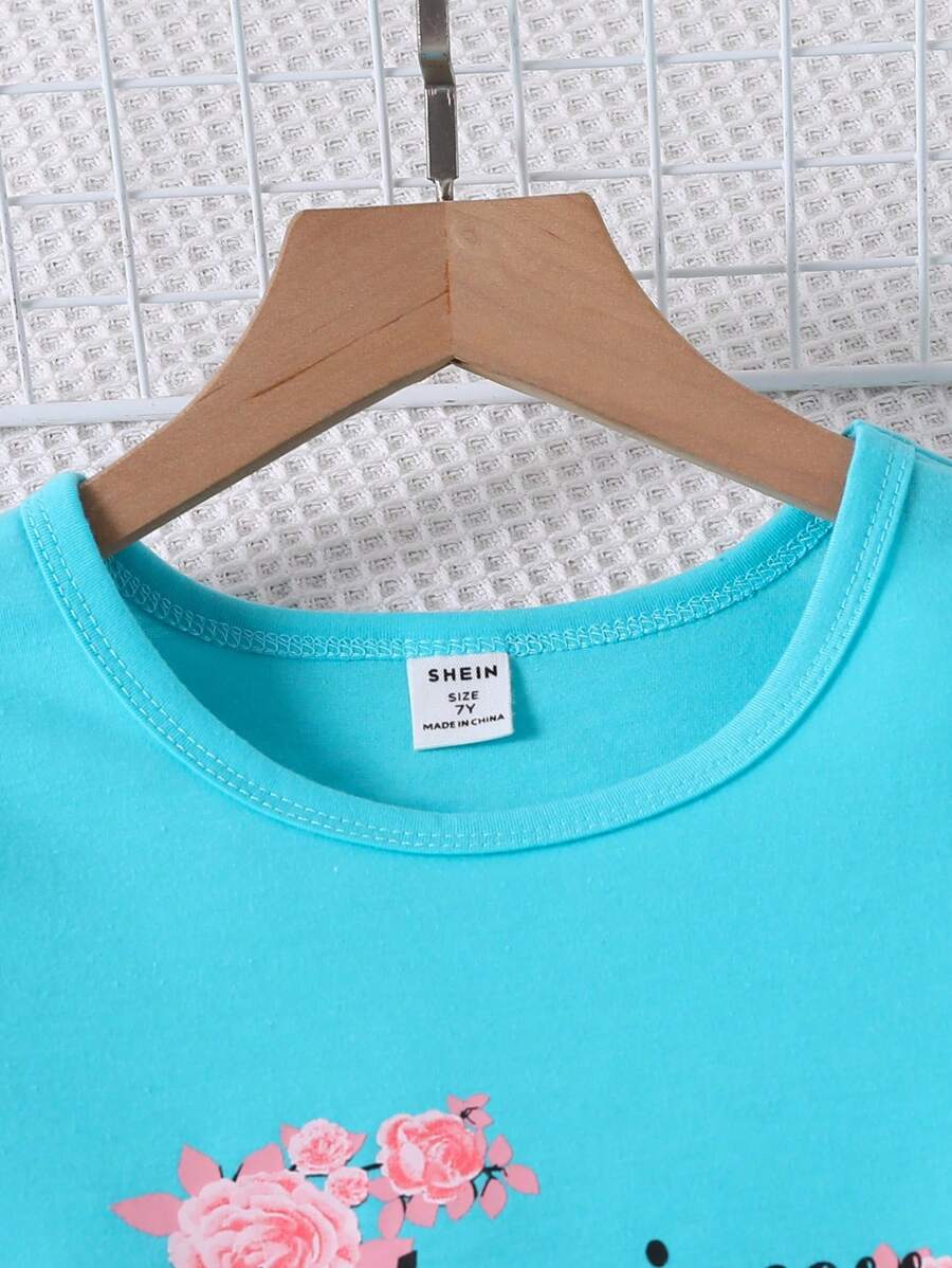 تي شيرت رسومات حروف فتاة صغيرة وبنطلون طباعة زهور