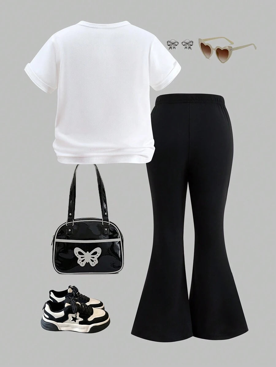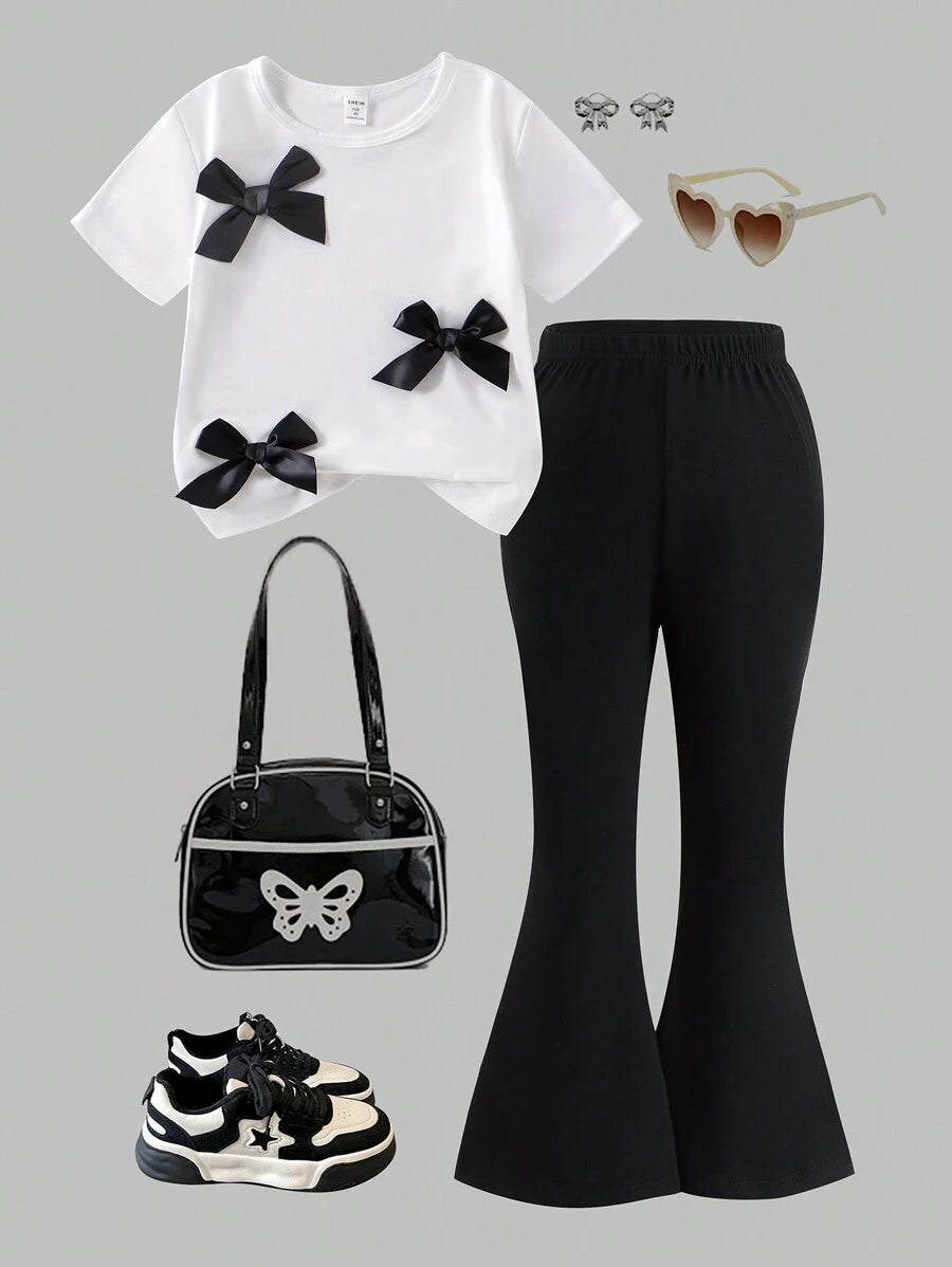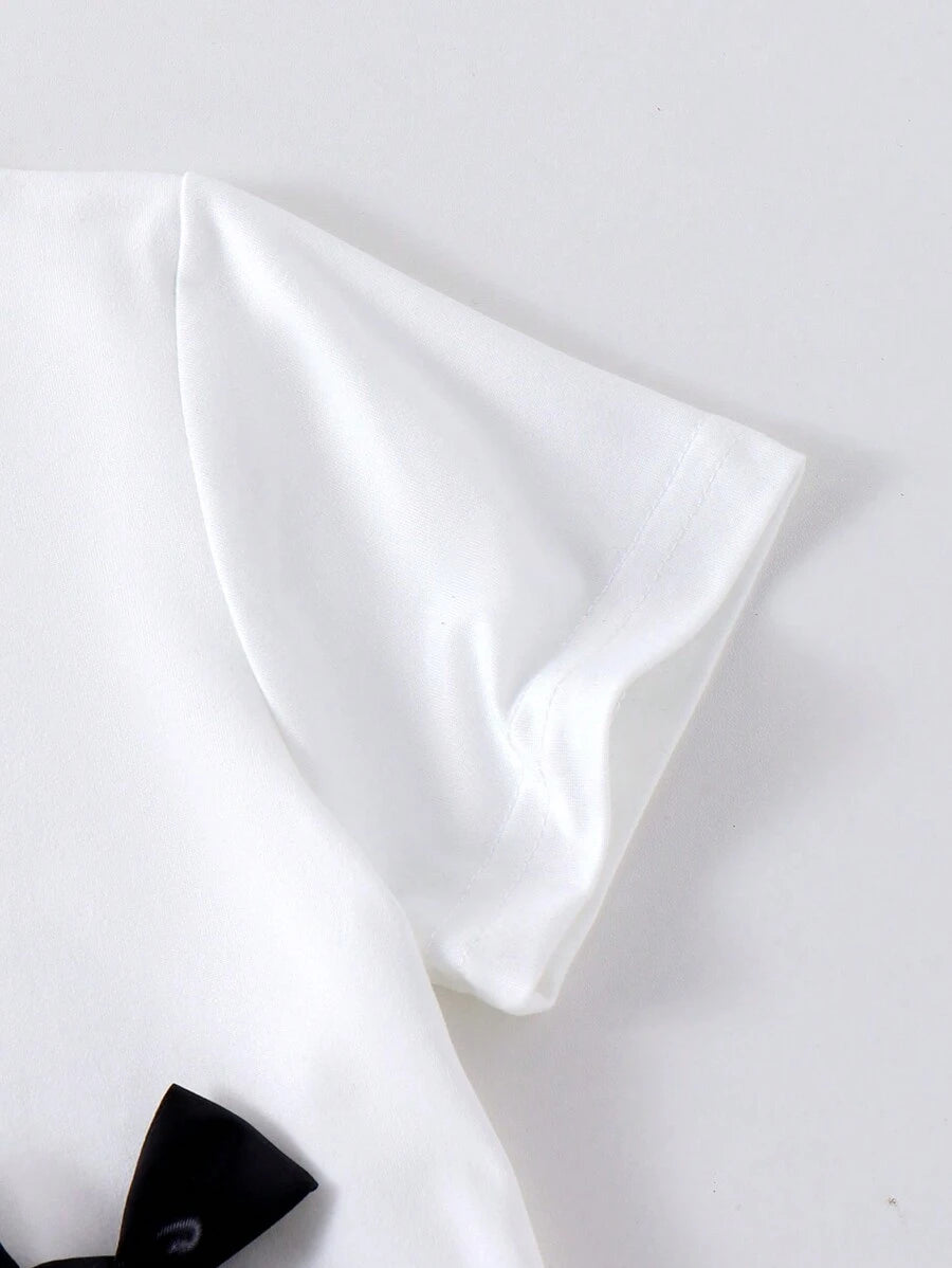 طقم تي شيرت أبيض كاجوال بأكمام قصيرة وربطة عنق مع بنطلون ذو ساق مرنة سوداء