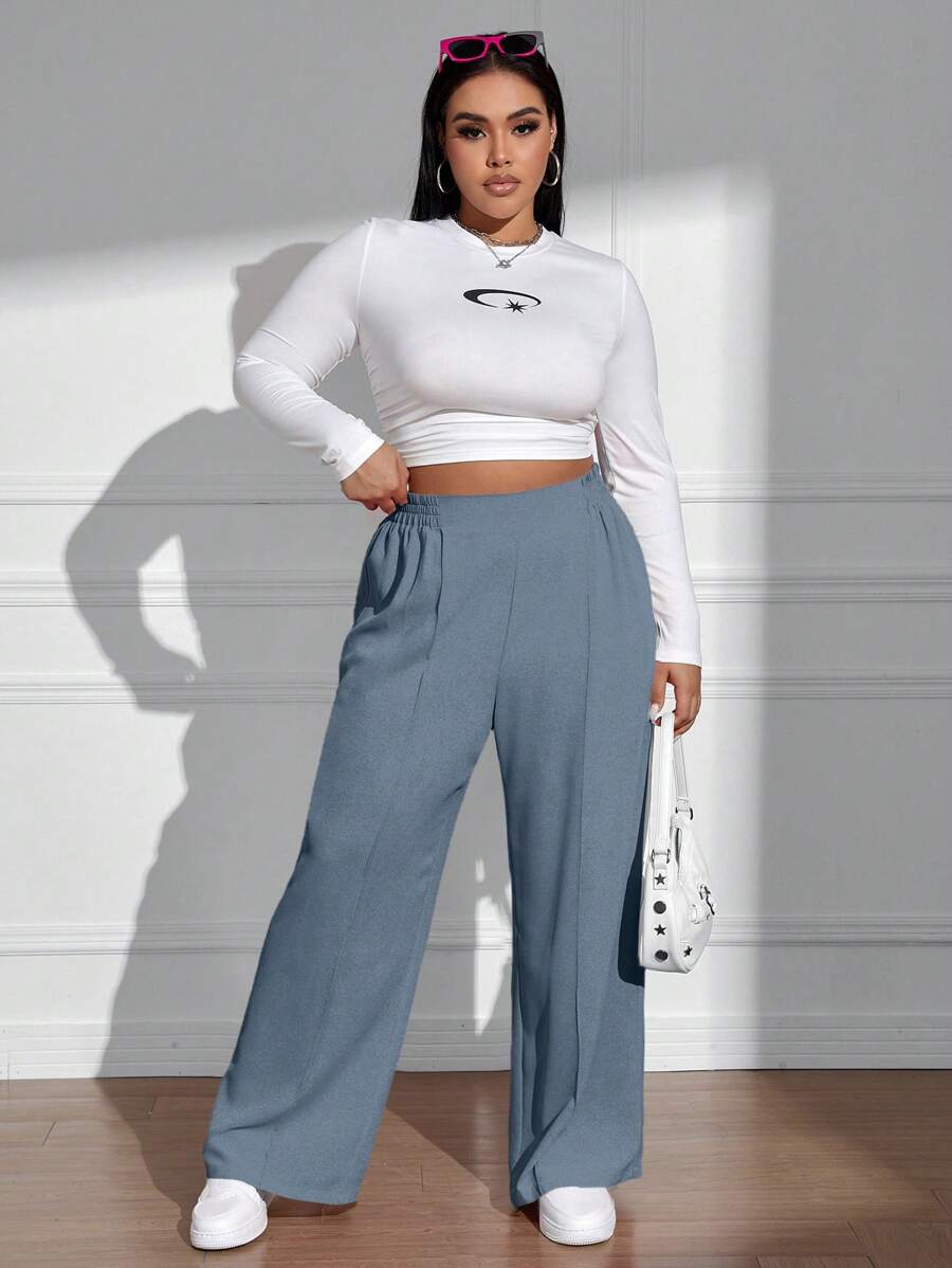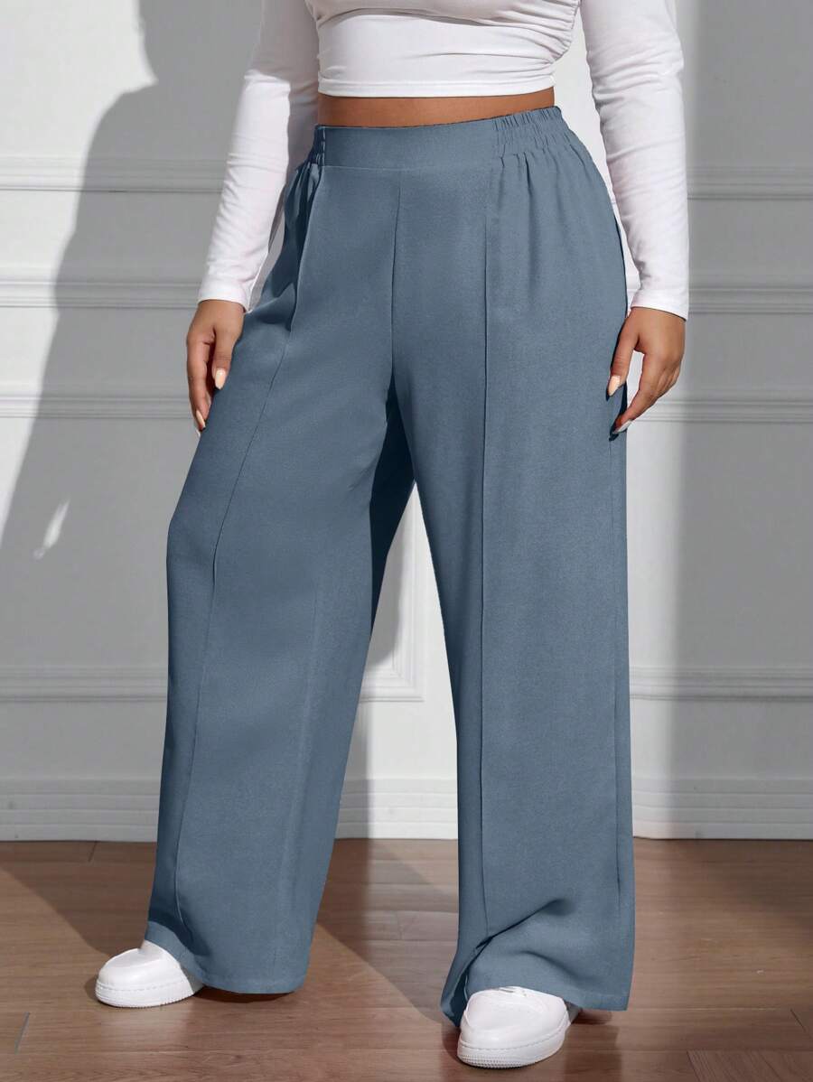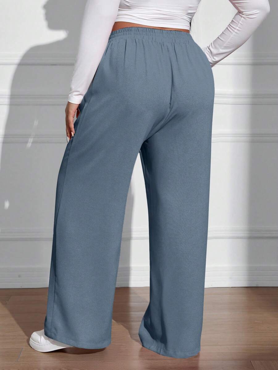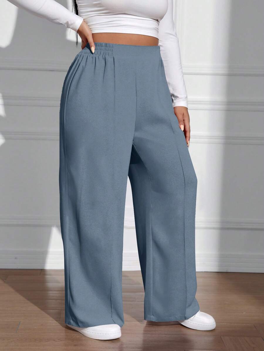 سراويل فضفاضة كاجوال واسعة الساق ذات خصر مطاطي موحد اللون للنساء بمقاسات كبيرة